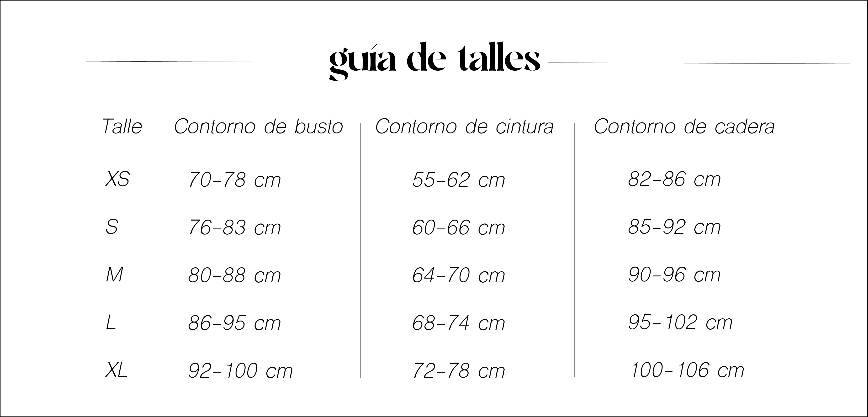 Los talles pueden variar mínimamente según la tanda de producción, las telas y los modelos.